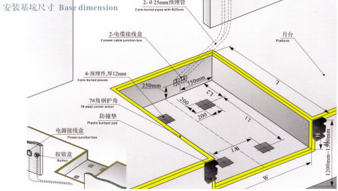 ●預(yù)埋管在地坑外的走向,由客戶視按鈕安裝位置,動(dòng)力電源接線盒位置決定管路走向。